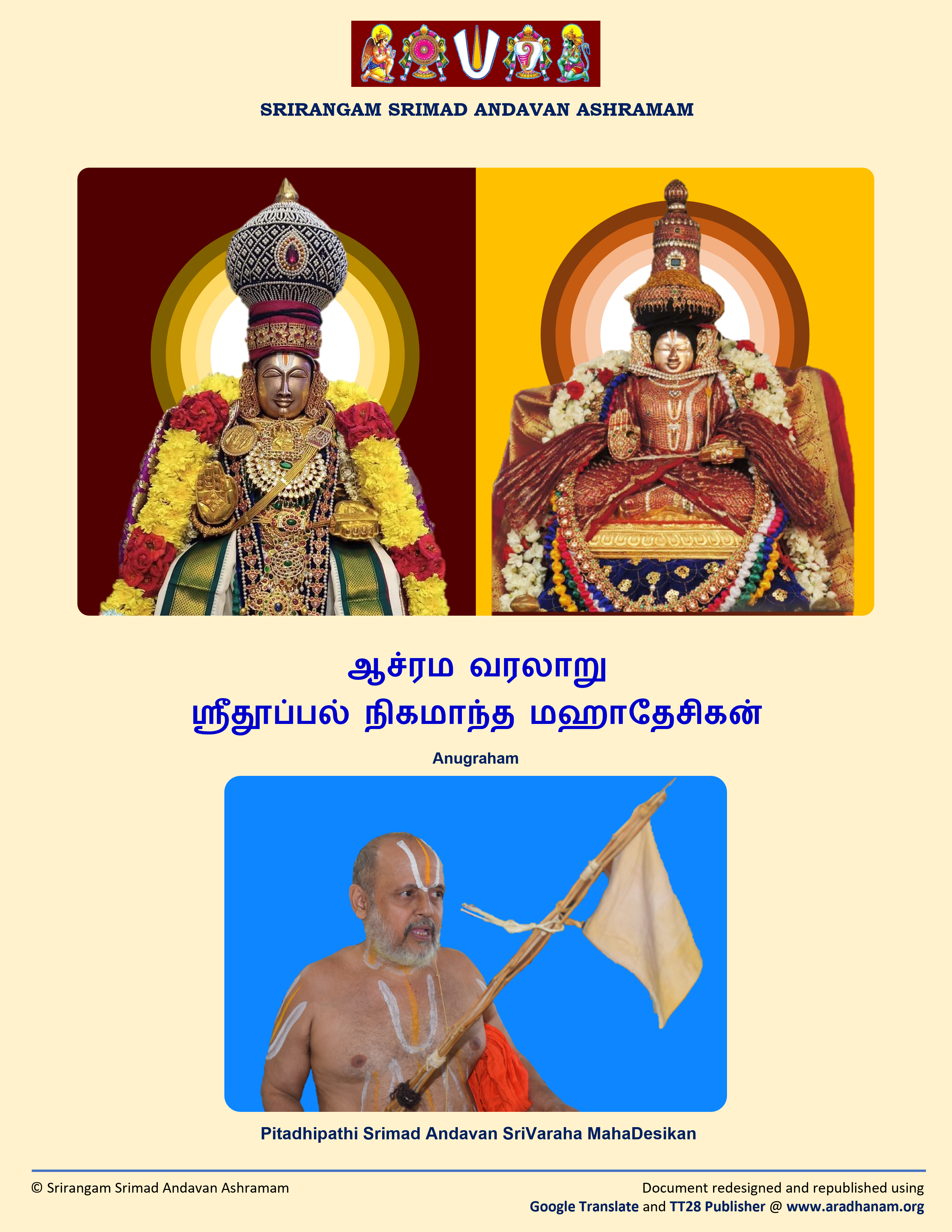 Tamil works: Swami Desikan’s Works in Tamil are numerous, out of which two need special mention: Paramathabhangam, where he describes and refutes 15 schools of philosophy, and Aharaniyamam where he describes the correct types of food to be consumed by a Vaishnava.